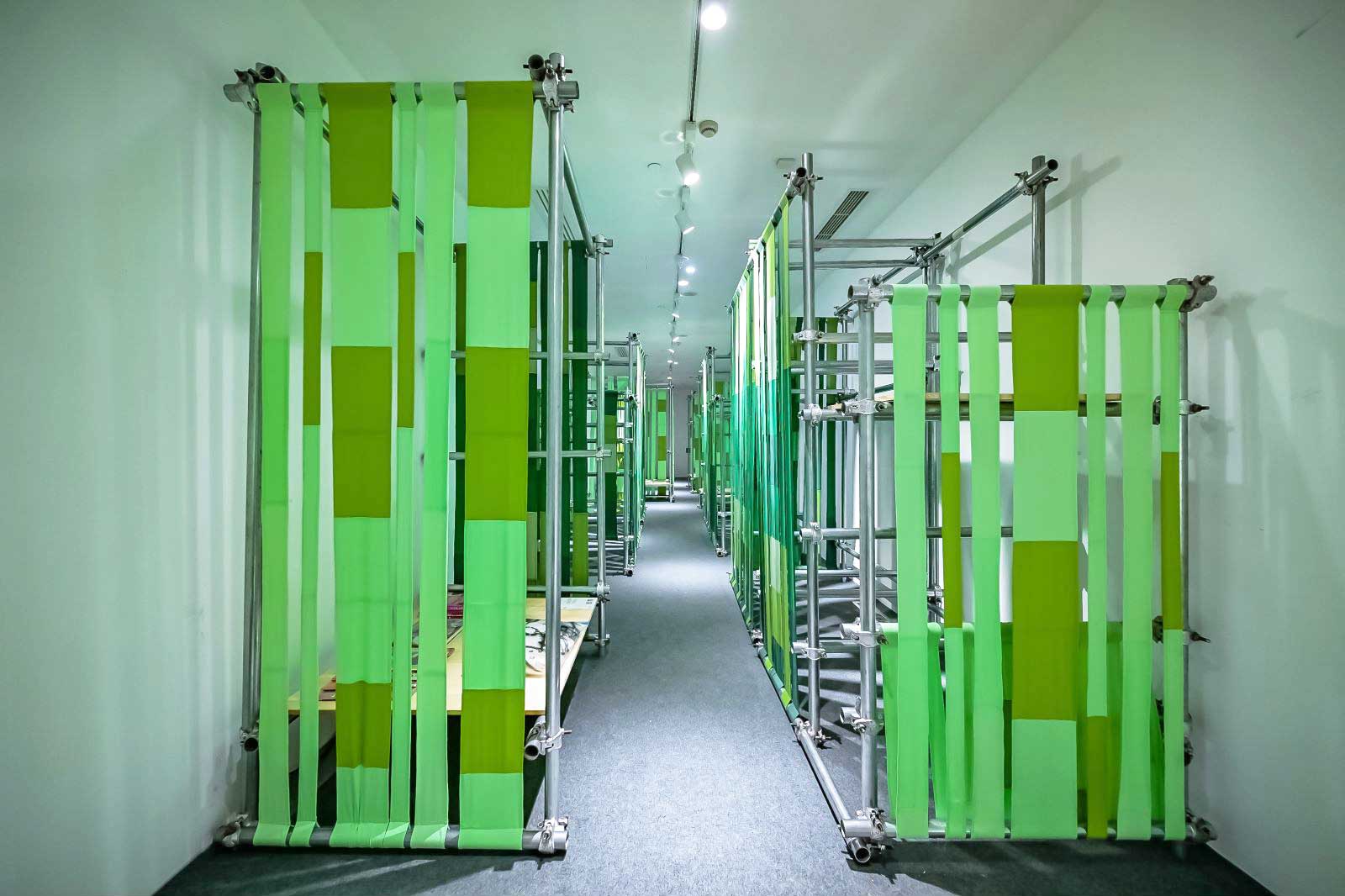 作為展覽的壓軸之作,解構與重組城市叢林的現代科技,不同材質、形態的舊椅子升級再造,能否令人回歸于“人閑桂花落,青青山澗中”的向往?明暗相見的SORONA®生物基材料制成的面料結合回收腳手架結構,在明亮燈光的映射下,創造出一片靜謐幽深的“竹徑”。空間盡頭設有休憩、閱讀、陳列三個功能區域,其中閱讀區陳列有SAME PAPER為本次展覽特別提供的30本珍藏樣書,讓藝術感與實用性“相遇”,將自然與生活合二為一,徘徊在一段浸染了時間與記憶的共生情感間。