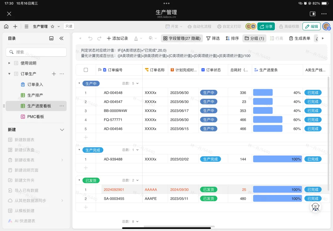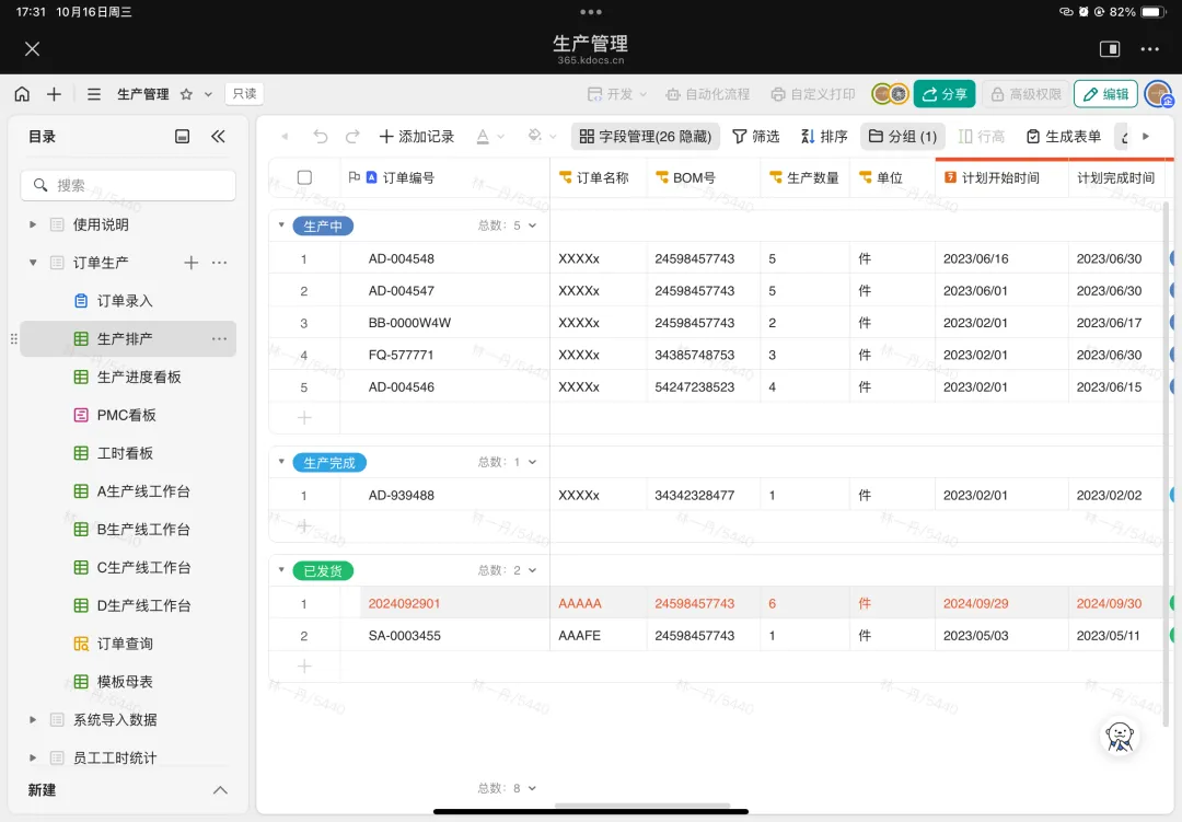 如今,年發(fā)紡織的員工可以隨時(shí)隨地辦公,不管是智能手機(jī)還是平板,都能實(shí)時(shí)錄入信息。同時(shí),使用者還可以在權(quán)限范圍之內(nèi)自定義流程、自定義打印,可以根據(jù)業(yè)務(wù)狀態(tài)靈活調(diào)整需求。與過(guò)去相比,訂單處理變得更加高效,倉(cāng)庫(kù)同事不需要在微信群中手動(dòng)記錄訂單數(shù)據(jù)再去進(jìn)行采購(gòu),業(yè)務(wù)員只需將訂單通過(guò)表單提交到多維表中,倉(cāng)庫(kù)同事即可根據(jù)多維表中的數(shù)據(jù)進(jìn)行采購(gòu)和發(fā)貨。庫(kù)房發(fā)貨后,快遞單號(hào)也會(huì)被填寫(xiě)到多維表中,系統(tǒng)會(huì)自動(dòng)發(fā)送信息到群里,告知業(yè)務(wù)員訂單已發(fā)出及單號(hào)。有了多維表格,不僅減少了業(yè)務(wù)員的詢問(wèn)工作的次數(shù),也提高了客戶的滿意度。