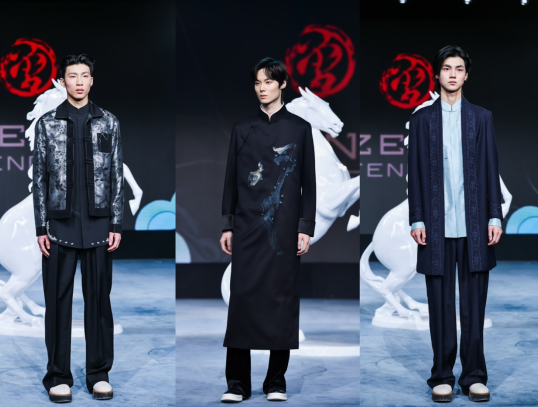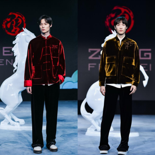 大秀開場,首套丙午系列高定男裝,由曾鳳飛品牌設計、定制,作品甄選桐昆絲絨面料,將丙午馬年元素與非遺割絨工藝相融,盡顯新中裝時代風骨。同時,特邀近幾季活躍在巴黎、米蘭國際時裝周的超模薛景倫開場演繹。設計師與超模以各自的藝術語言,完成了對纖維面料的時尚表達。