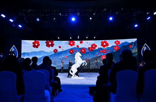 同期,“敘事中國美”纖維藝術展也在發布會序廳呈現。現場展出了歷屆大秀中十五套代表性作品,循時間之序,勾勒出東方美學由形到意、由技入韻的發展軌跡。在AI技術賦能下,一件件作品被置入具有中國文化意象的數字場景中,延展了纖維在傳統與未來之間的敘事空間。中國纖維已從單純的“原料”,演變為連接傳統與當代、科技與藝術的“語言”,重構了高性能與審美表達之間的平衡。
