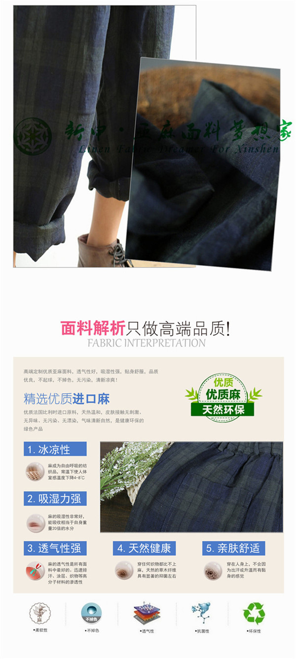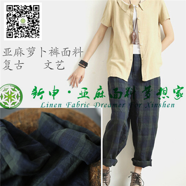 復(fù)古文藝格子亞麻休閑寬松長褲面料