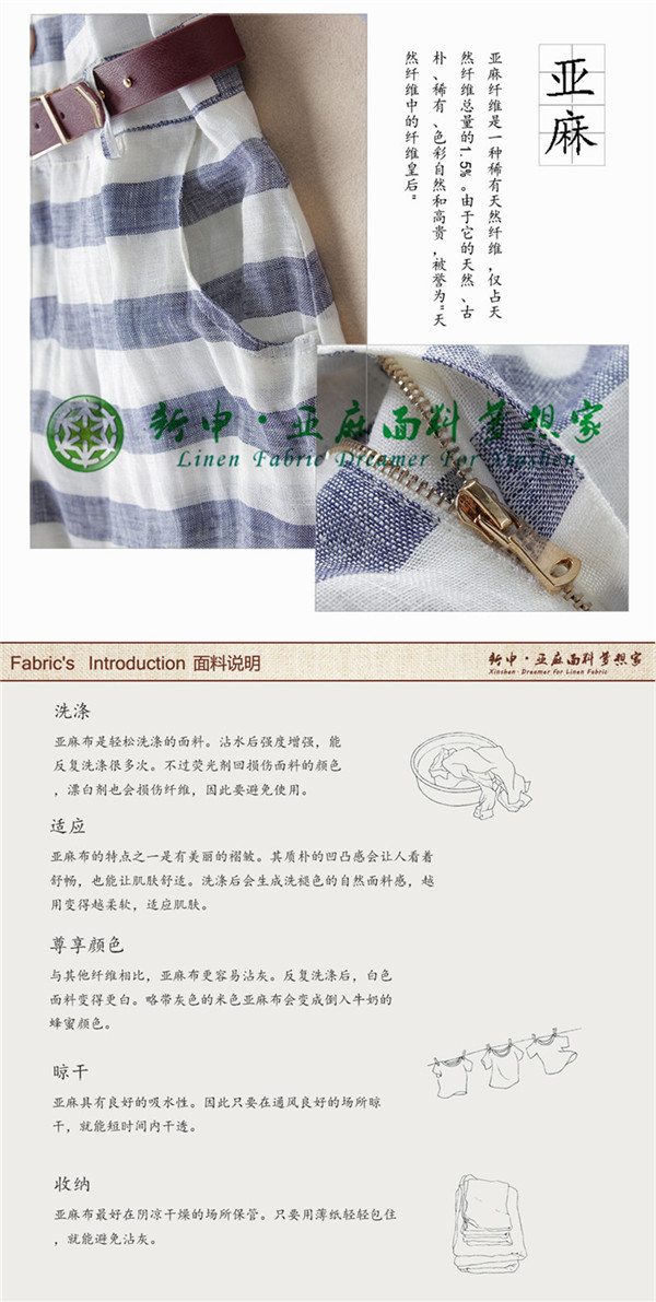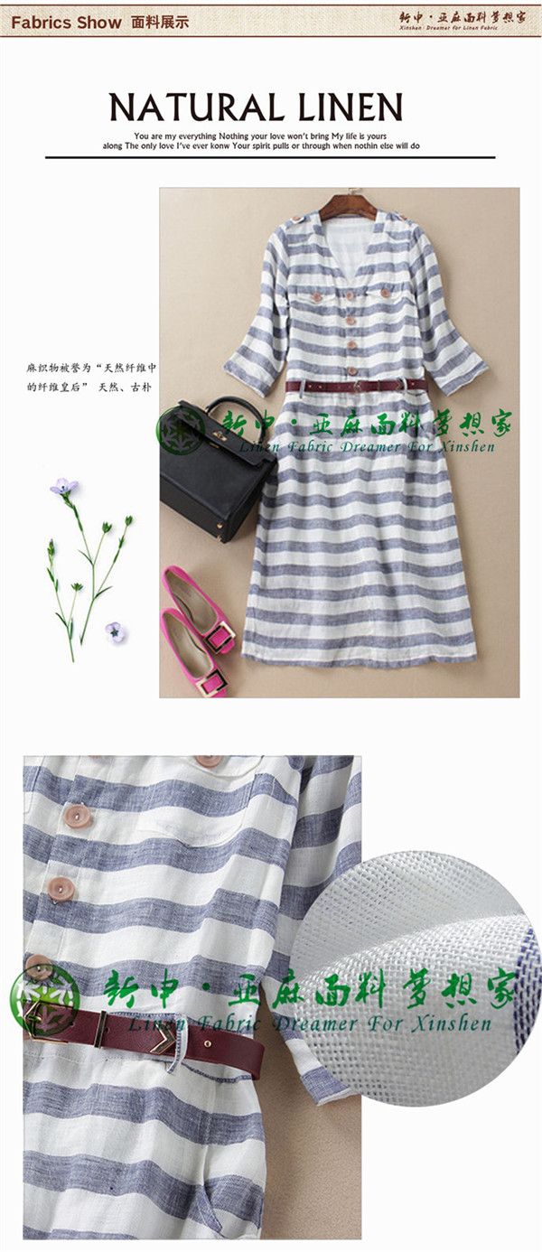 優質純天然亞麻藍白條子款式連衣裙面料