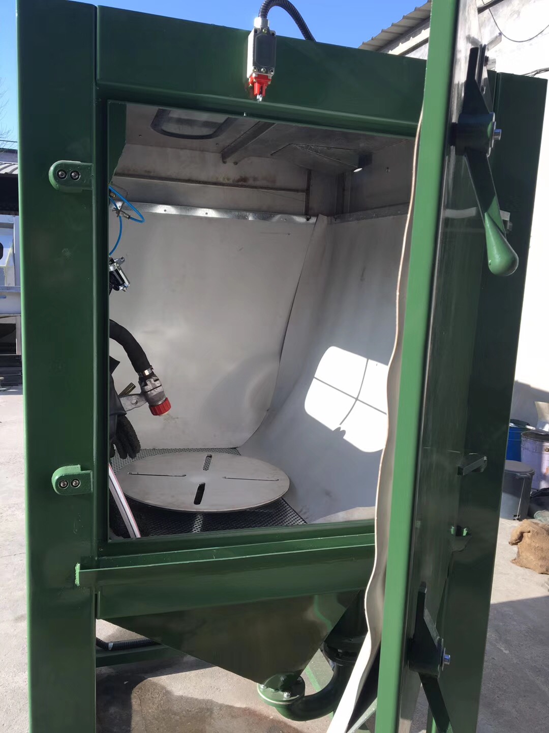 箱式噴砂機是將噴砂系統與箱體防護組合到一起,將噴砂空間控制在一個范圍里,實現沒有粉塵外泄的噴砂狀態。