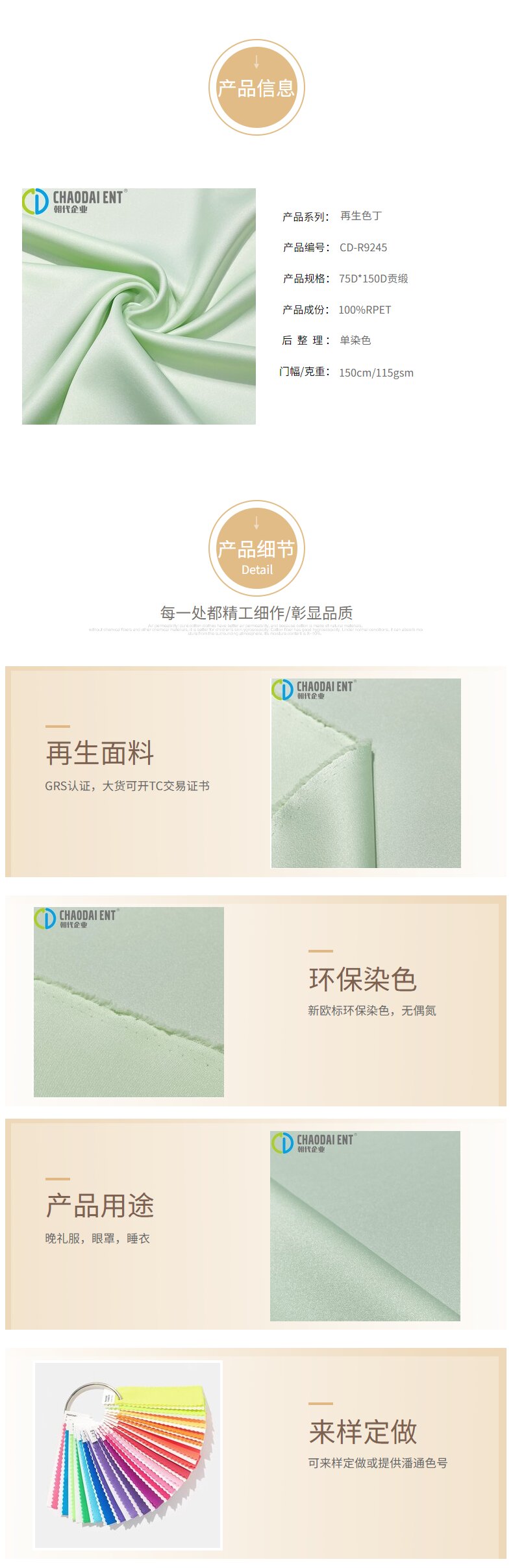 關鍵字:再生色丁,色丁貢緞面料,GRS認證面料