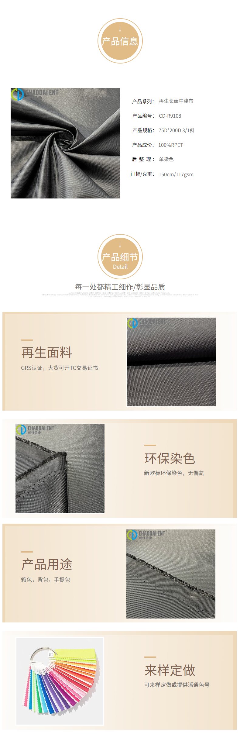 關鍵字:再生牛津布面料,GRS認證面料,再生滌綸,長絲牛津布面料