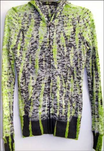 滌棉爛花面料略顯輕薄,但是里帽及袖口和下擺的螺紋使得整件衣服增加了點厚重感。整體染灰色底后繩絞拔色后再套染綠色,顏色對比強烈。豎條狀的花紋能夠在視覺上拉長身形,更顯穿衣者的纖瘦和苗條。