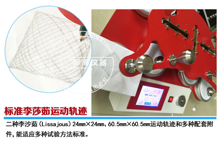 模式二:圓形織物試樣在一定的壓力下,與標(biāo)準磨料按李莎如(Lissajous)曲線的運動軌跡進行互相磨擦,導(dǎo)致試樣破損,以試樣破損的耐磨次數(shù)表示織物的耐磨性能。該原理對應(yīng)于標(biāo)準規(guī)定的織物耐磨性能試驗。