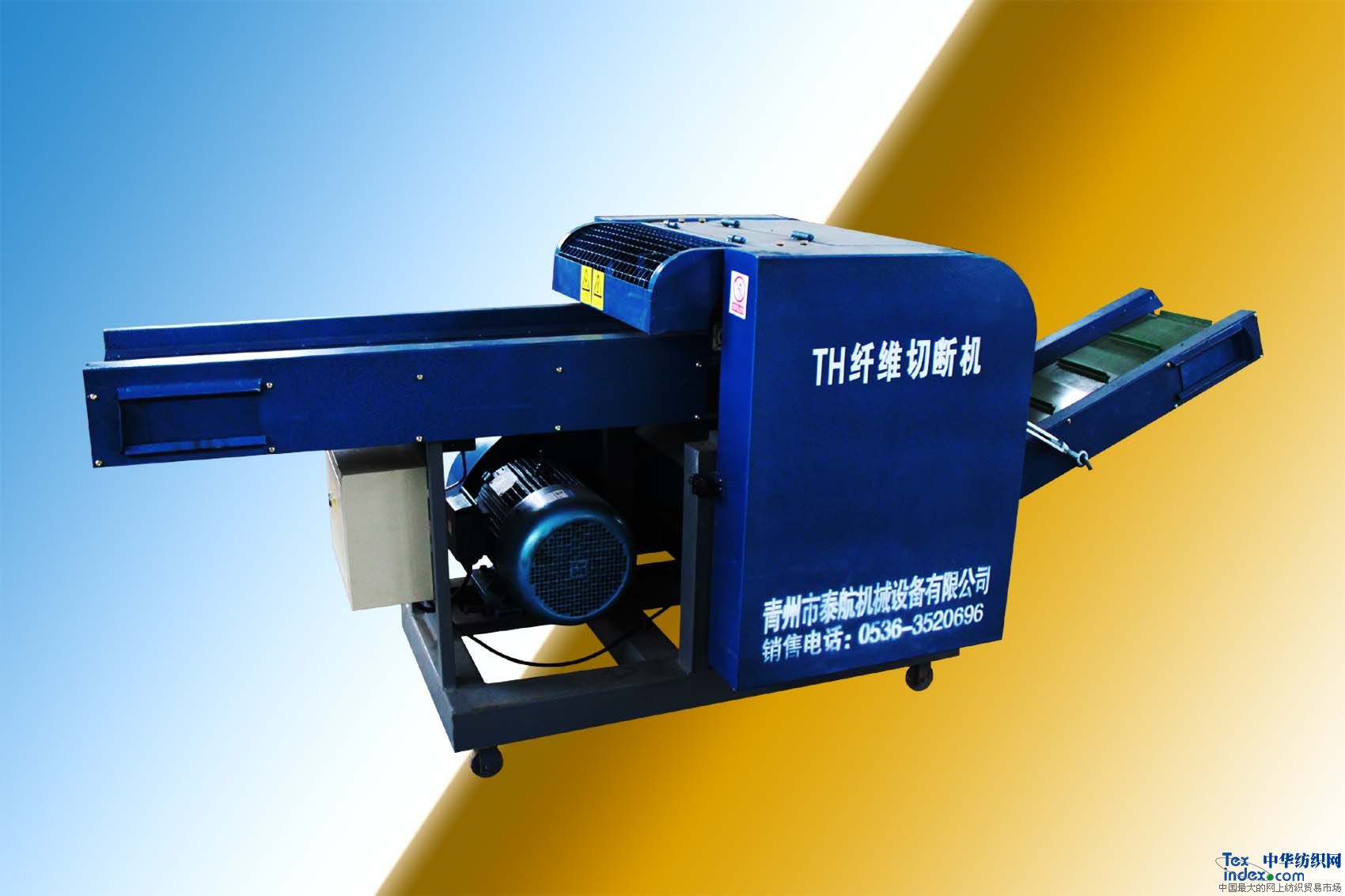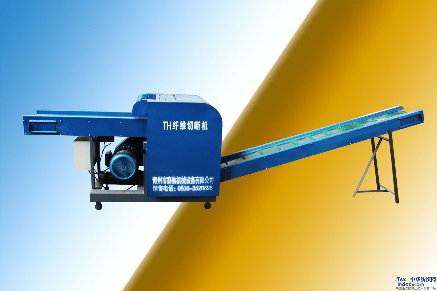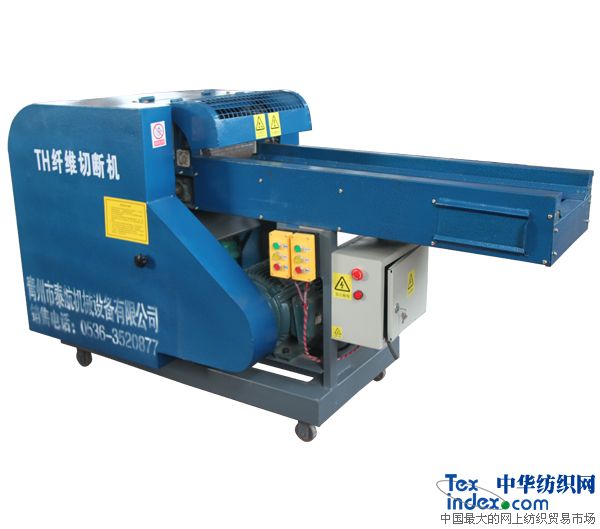 青州市泰航機械設備有限公司生產的TH系列旋轉扭刀式纖維切斷機(又稱碎布機、短切機、剁線機、碎布塊機、破布機等)。本機廢除傳統往復式直刀板,應用國際領先斜旋扭式滾動刀與定刀切合點移動剪切設計,實現連續高速剪切。產品設計先進,外形美觀,經濟實用,控制靈敏,剪切利落徹底。