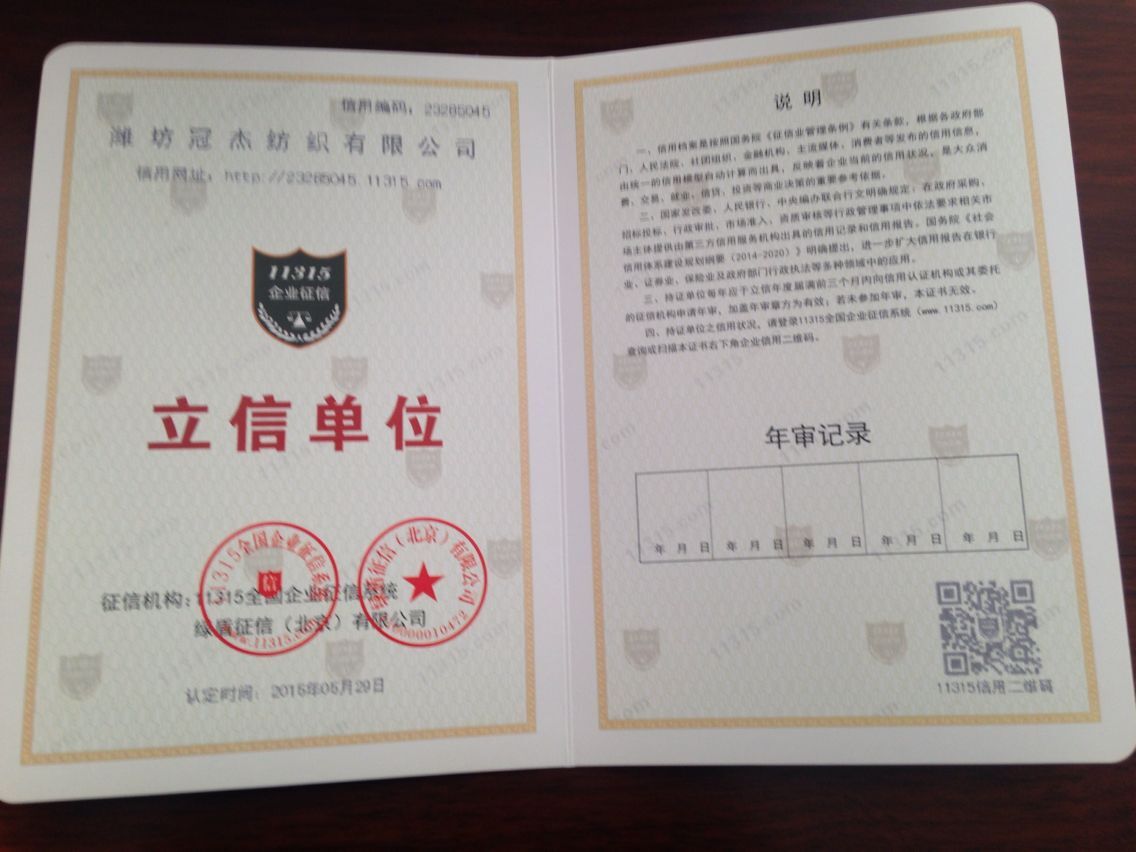 濰坊冠杰紡織有限公司,位于有“中國紡織之鄉”和“風箏之都”美稱的山東濰坊。是集紡織、印染、針織、貨物進出口和技術進出口于一體的大型紡織企業集團公司。