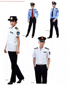 春秋季著制式長袖襯衫,戴藍色監督帽,使用軟肩章,掛臂章和胸牌,襯衫下擺系于褲內,制式長褲,佩戴統一制式領帶,系黑色皮帶;著制式西式套裝時,戴藍色監督帽,使用硬肩章,掛臂章和胸牌,襯衫下擺系于褲內,制式長褲,佩戴統一制式領帶,系黑色皮帶。