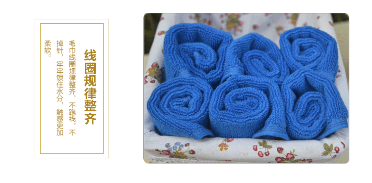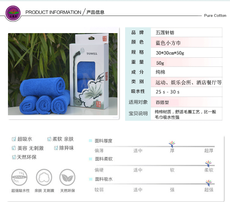 毛巾廠家直銷酒店用品毛巾全棉32線50g藍(lán)色小方巾選取材料為純天然的巴基斯坦棉紗,采用天然的材料與精湛的毛巾制作工藝結(jié)合而成;不加任何有刺激、傷害人體的化學(xué)染劑。綠色環(huán)保、源自天然。優(yōu)質(zhì)的棉紗做出來的毛巾,不僅舒適柔軟而且具有按摩皮膚和緩解疲勞的生物功效。毛圈平整、均勻,毛巾摸著柔軟、蓬松。聞著無異味。水洗不會掉色。