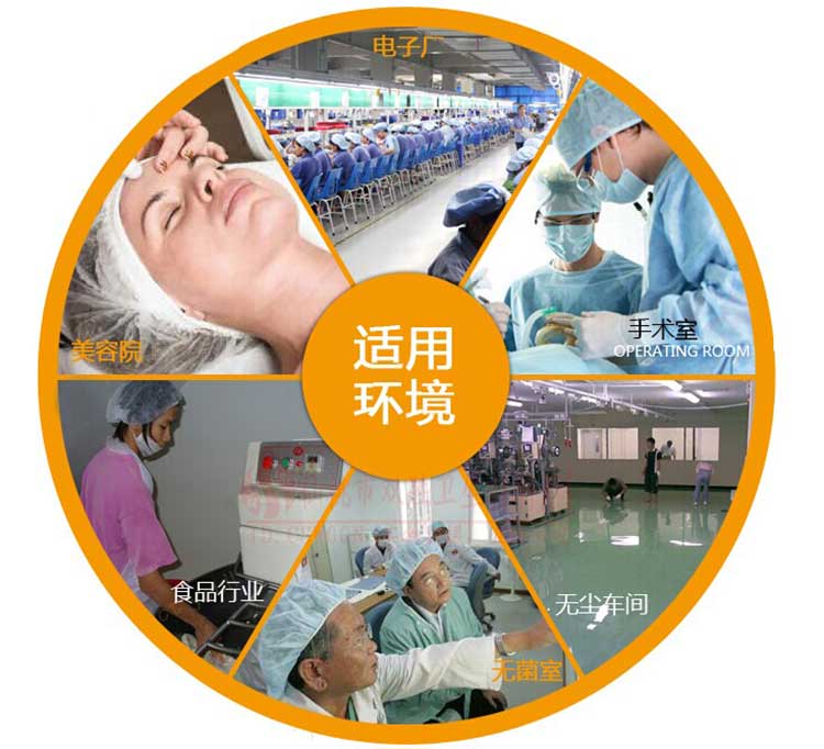 可適用于電子制造業,無塵車間,餐飲服務業,食品加工,學校,騎機車噴涂加工沖壓五金,衛生院,手加工業,醫院、美容、制藥、工廠、環境清潔、公共場合等。