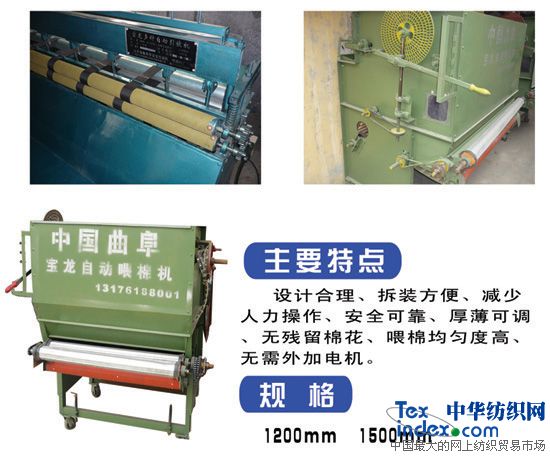 寶龍喂棉機(jī):設(shè)計(jì)合理、拆裝方便、減少人力操作、安全可靠、厚薄可調(diào)、無殘留棉花、喂棉均勻度高、無需外加電機(jī)。